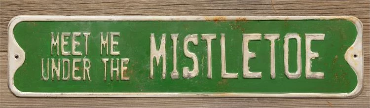 Hugs and kisses are in store this holiday season. Give your holiday decor a fun festive twist with this vintage style Meet Me Under the Mistletoe Street Sign.