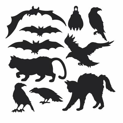 Create a eerie Halloween display with these shadowy bat, cat and raven cutouts.