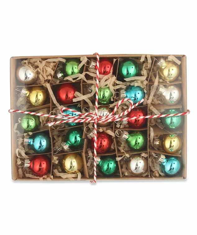 Create a jolly mood with these fun and festive mini ornaments in red, green, blue, gold, and silver.