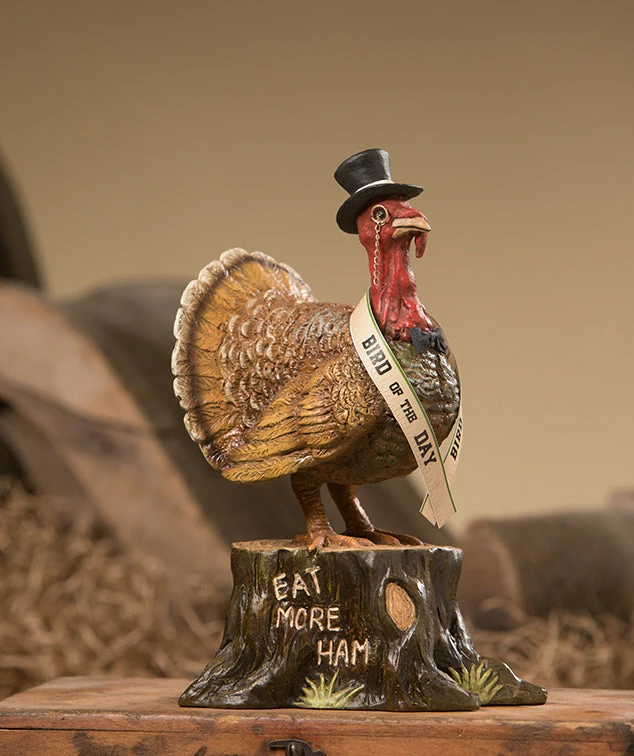 Lend a sense of humor to your Thanksgiving celebration with this quirky Bird of the Day figurine. ” Eat More Ham”