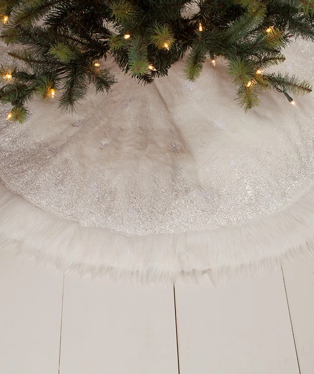 Dream up a winter wonderland with this faux fur, glitter and bead Winter Snowflake Tree Skirt