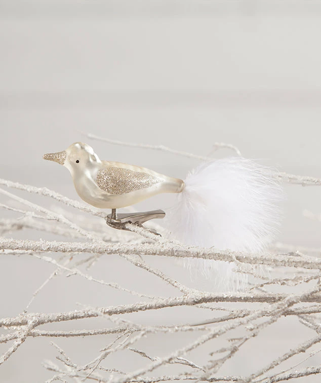 Add a touch elegance to your Christmas decorating with this Winter White Glass bird Ornament.