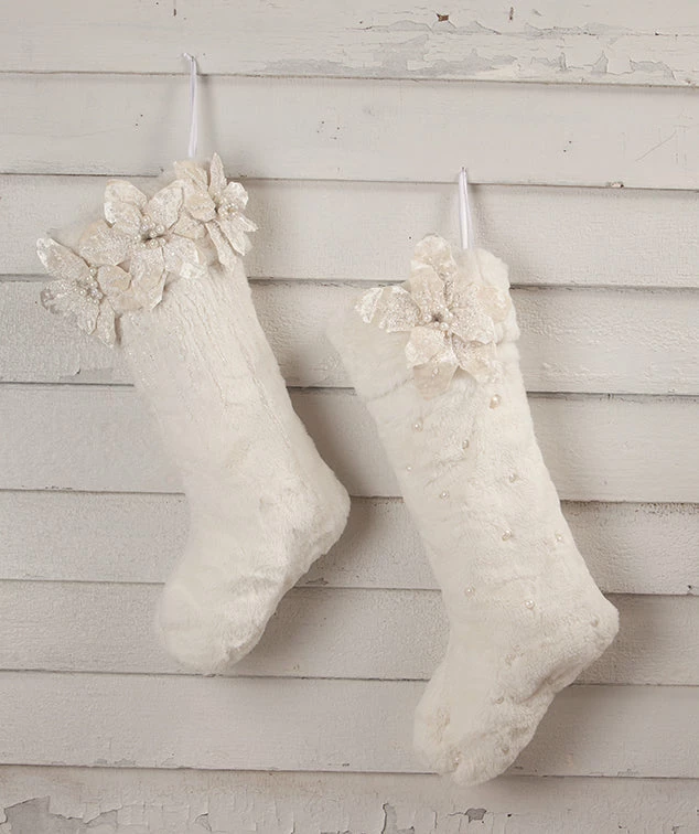 Bring the winter wonderland to your mantle with these white faux fur Poinsettia Stockings.