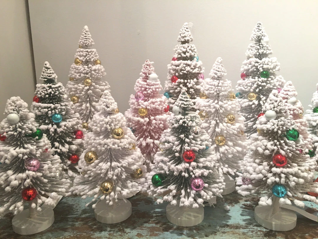 Let the fun begin! Add a festive touch to your Christmas decor with these snowy silver bristle trees decorated with brightly colored ornaments.