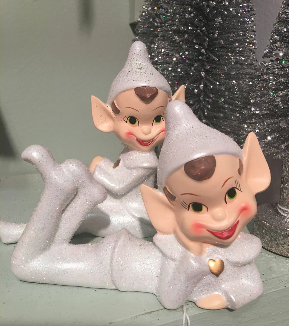 Make them smile with these cute Retro Pixie Elf figurines dressed in glistening winter white.