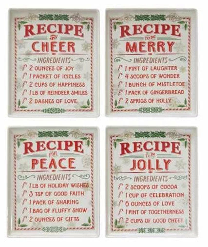 Serve up the recipes for Christmas cheer, merry, peace, and jolly to your table with this whimsical set of stoneware plates.