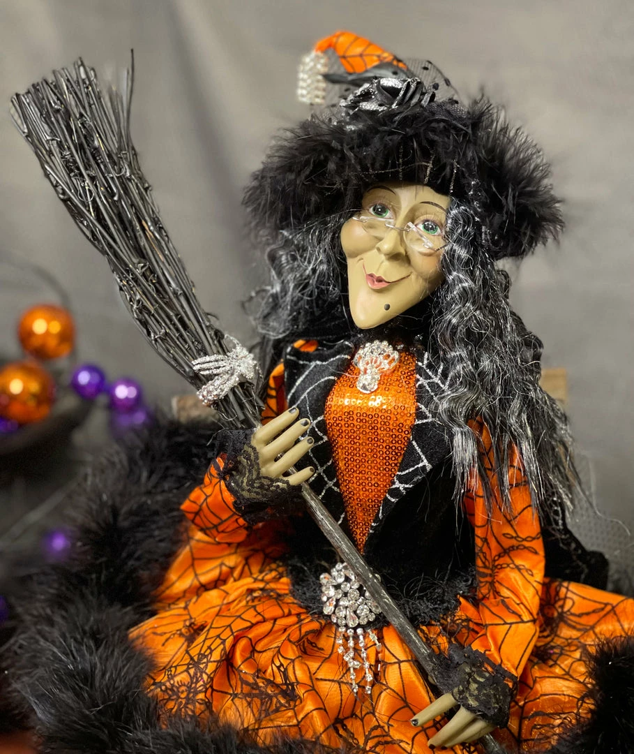 Friendly and fabulous this hip witch has got it going on. Dressed to the hilt in a spicy orange spiderweb dress, feathery trim, and faux jewels. Make your Halloween decorating fabulous with this Pretty Witch.