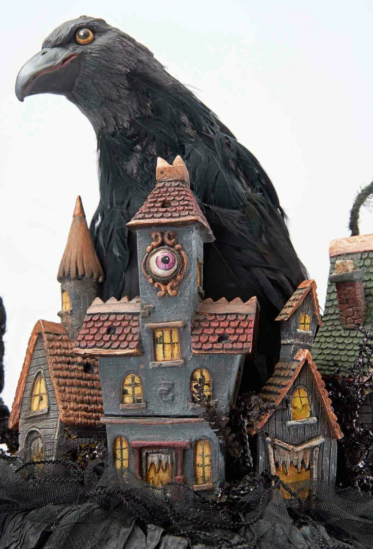 Seemingly straight out of a movie set, Which Way to Witchville Witch Wall Piece is an impressive Halloween statement piece that will keep the big, and small ghouls and goblins mesmerized. Discover a haunted village nestled in her hat and a scheming raven that’s up to no good—an amazingly detailed piece for the discerning Halloween collector.