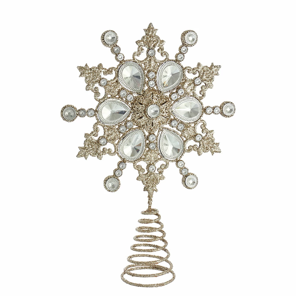 Add a touch of sparkle and glamour to your Christmas decor with this champagne glittered Jeweled Snowflake Christmas Tree Topper.