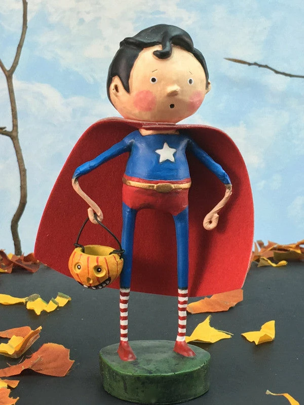 Our Hero feels powerful in his superhero Halloween costume, ready to spring into action. He’s all dressed up in a classic red superhero cape, blue tights and signature Lori Mitchell striped socks. Our Hero will put a smile on your face. Display with the rest of the trick-or-treat gang together for a super cute Halloween scene.