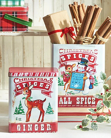 Deck the halls in retro style with these vintage-inspired spice tins featuring a sweet reindeer and a festive snowman.